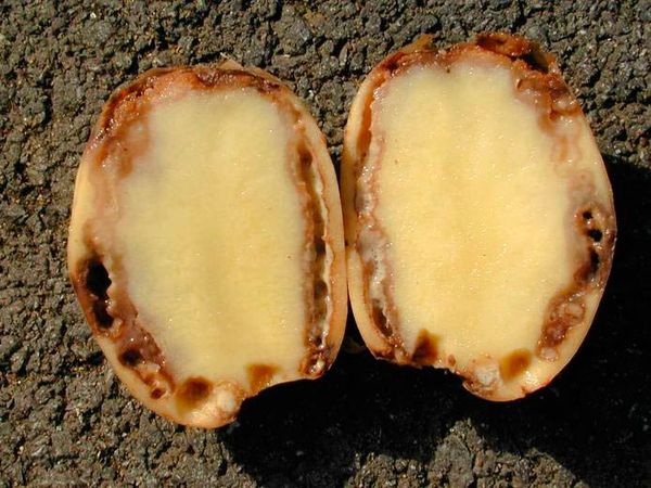 Les tubercules de pomme de terre sont l'objet d'agents pathogènes. Sains à l'intérieur, ils sont recouverts d'une couche ceinture de pourriture brun rougeâtre. Si la zone touchée est grande, des zones humides d'une teinte foncée apparaissent sur la peau. La partie aérienne de la plante se fane rapidement, les plaques foliaires se déforment et jaunissent. Afin d'éviter le développement de la pourriture brune, les jardiniers recommandent de traiter le matériel de plantation avant la plantation et de ne pas perturber la rotation des cultures.