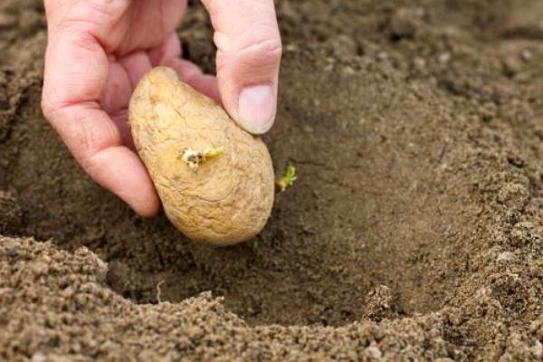 Les tubercules sont plantés dans des trous. La profondeur correcte pour eux est de 7 à 10 cm. À cette profondeur, les pommes de terre se réchaufferont mieux et germent rapidement. Les tiges germées doivent être recouvertes de terre. Cette procédure devra être répétée dans une semaine. Cela permettra la formation de tiges fortes, ce qui aura un effet positif sur le rendement. Si les dates de débarquement étaient postérieures, alors la profondeur du trou augmente de 3 cm (surtout cette règle s'applique aux périodes sèches).