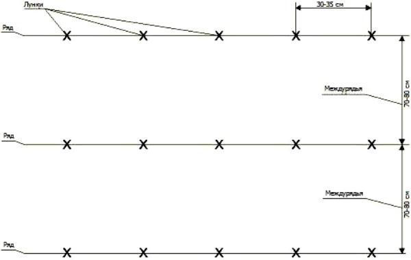 Le plus souvent dans la littérature, vous pouvez trouver la déclaration selon laquelle environ 6 arbustes doivent être plantés par mètre carré.Si nous prenons juste un tel nombre de plantes, alors dans le cas d'un interligne d'environ 70 cm, il est nécessaire de maintenir une distance entre les buissons de 26 cm.En pratique, pour ne pas courir avec une règle, cela la distance correspond pratiquement à un segment d'une largeur et demie de la largeur d'une pelle conventionnelle. Il faut naviguer par le diamètre du trou creusé avec une telle pelle (environ 25-27 cm).