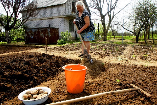 Les pommes de terre sont plantées sous une pelle du côté sud, où le site de plantation est uniforme, le sol est meuble et consomme de l'humidité, le sol se réchauffe rapidement, le site est uniformément éclairé par le soleil. De cette façon, il est plus facile de planter des pommes de terre ensemble : l'un fait des trous le long des lignes tracées, le second dispose les tubercules germés. Certains jardiniers soulèvent une couche de terre et y déposent des tubercules.