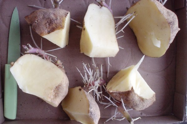 Habituellement, pour cela, les boîtes sont sorties dans la rue. La température peut être ajustée avec une pellicule plastique. Dans ces conditions, les tubercules continuent à germer. Les pousses poussent de 2-3 cm en 28-35 jours et acquièrent une couleur violet verdâtre. Un jour ou deux avant la plantation, les pommes de terre doivent être divisées en parties. Le nombre de parties est égal au nombre d'yeux.