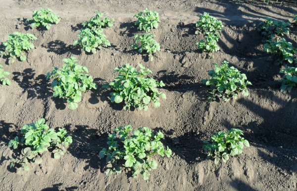 Les pommes de terre de semence sont plantées dans des billons isolés. Il est préférable d'atterrir dans un endroit ensoleillé et protégé des vents. Lors de la plantation sous une pelle, marquez d'abord le champ à une distance de 50-60 cm.Le sillon doit être creusé à environ 6 cm de profondeur. Le fond des rainures doit être bien desserré. La plantation est effectuée après 10-15 cm d'affilée. Ainsi, les racines poussent dans des directions différentes, elles ont suffisamment de place, il n'y a donc pas de compétition et une nutrition optimale est fournie. Les morceaux sont disposés avec une coupe et poussent vers le haut, en appuyant légèrement dans le sol. Les petites tranches doivent être placées plus souvent et les grandes moins souvent. Ensuite, les graines sont saupoudrées de terre, ce qui forme un rouleau de 8 à 10 cm de haut et d'une largeur de base de 35 cm. Habituellement, après 2,5 à 3 semaines, des pousses de pomme de terre apparaissent, vous devez alors monter le rouleau plus haut. à 25-27 cm, avec une largeur de 65-70 cm.