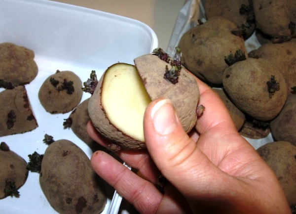 Il est important de sélectionner des tubercules de même taille pour le semis. Le calibrage vous permettra d'obtenir une tige uniforme, et des plantes identiques ont besoin du même éclairage et de la même nutrition du sol.Afin d'économiser du matériel de plantation, vous pouvez couper les tubercules, mais c'est important - il doit y avoir des germes sur chaque partie. La coupe doit être traitée avec de la cendre ou des produits chimiques pour éviter le développement de maladies.