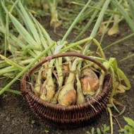 L'état de préparation des atterrissages est déterminé par l'état de la plume - elle doit se coucher. À ce stade, les oignons sont soigneusement versés avec une fourche et retirés à la main. La récolte récoltée est envoyée à sécher dans un endroit chaud (20-30 °C) ou dispersée directement sous le soleil. Après séchage, le système racinaire des bulbes doit être coupé.