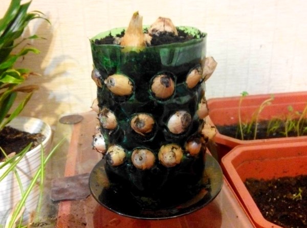 - puis des trous sont faits sur le côté. Ces trous doivent être légèrement plus petits que la taille des bulbes. Ils joueront le rôle d'embouteillages, empêchant la terre de tomber du conteneur. Les trous sont faits avec des ciseaux ou percés avec un objet pointu en fer chauffé;