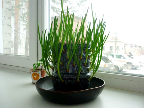 Le conteneur résultant avec des bulbes doit être placé sur une palette et placé sur un balcon ou un rebord de fenêtre. N'oubliez pas qu'un tel oignon doit être arrosé périodiquement. L'excès d'eau s'écoulera du récipient dans le puisard. Par conséquent, vous devez surveiller la présence d'eau et la verser à temps, sinon elle commencera simplement à déborder sur les bords. Après un certain temps, des plumes d'oignons verts apparaîtront des trous de la bouteille. Vous pouvez maintenant ajouter des vitamines à vos repas d'hiver.