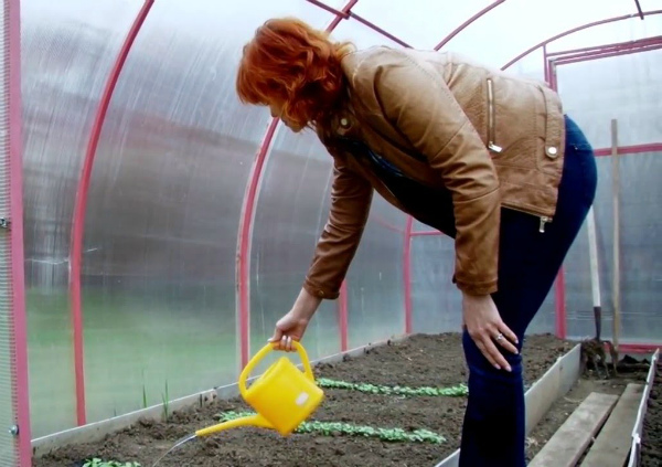 Voyez à quoi ressemble le processus d'arrosage manuel des radis lorsque vous plantez ensemble des pommes de terre avec des radis sous agrofibre.