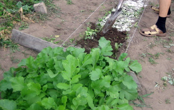 Si le sol ne diffère initialement pas en termes de valeur nutritionnelle et de fertilité, des engrais peuvent être appliqués, par exemple de l'urée, du compost. Si le sol est suffisamment fertile, cela ne vaut pas la peine de le fertiliser à nouveau avant de semer ou de planter autre chose, car pendant le mois ou le mois et demi où le radis a poussé ici, il n'a même pas eu le temps d'épuiser son horizon, et il est préférable de planter à sa place des plantes avec un système racinaire différent.