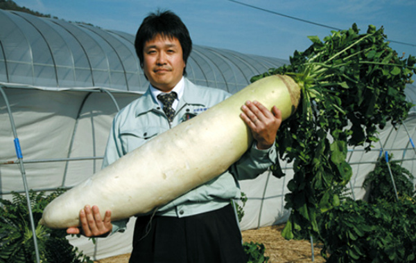 Les racines de cette culture sont vraiment impressionnantes par leur taille. Certaines espèces mesurent 60 cm ou plus de longueur et leur poids varie de 600 g à plusieurs kilogrammes. La plus commune et la plus répandue au Japon, l'espèce "Aokubi" a une forme similaire à celle des carottes, mesure 25 à 35 cm de long et 6 à 10 cm de large de diamètre. Mais le type de "Sakurajima" se distingue par des racines géantes qui ressemblent à un radis à l'extérieur, mais à l'intérieur sont rose vif. Maintenant, en Europe, de nombreux types de daikon sont cultivés: "César", "Dragon", "Empereur", "Japanese Long", "Minovashi" et autres.