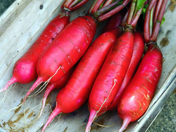 Ce radis prend la forme d'un cylindre, devient rouge vif (chair blanche). Convient pour le stockage pendant la saison froide (fin de l'automne - hiver), il est donc recommandé de semer les graines en juillet ou en août.
