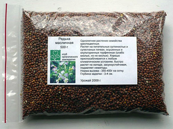 Les graines de radis sont très similaires aux graines de radis - elles sont également assez grosses et brunes. Lors de l'achat, vous devez faire attention à leur couleur: un brun riche indique de la fraîcheur, mais les graines décolorées grises ont clairement été stockées pendant longtemps, vous ne devez pas risquer de les semer, elles ont très probablement une germination inférieure à la normale.