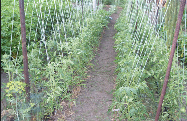 - tirez un fil solide sur une barre haute à un niveau d'environ 2 m - alors les ficelles de la jarretière doivent être suffisamment longues pour atteindre à la fois le support (fil) et la tige. Les cils de tomate s'enrouleront autour de ces cordes au fur et à mesure qu'ils grandissent;