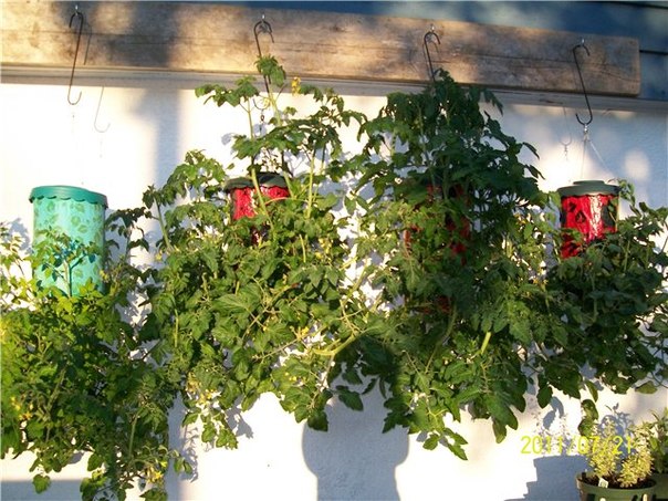 La récolte est très simple, le nombre de parasites est réduit, la pourriture du sol ne se produit pas, ainsi que les maladies fongiques. Les tomates cultivées en pots sont bien éclairées, le système racinaire se développe rapidement et l'arrosage peut être considérablement réduit. Planter dans des endroits où il n'y a pas de sol permet de rentabiliser l'utilisation du territoire.Lors de l'arrosage, l'eau et les nutriments saturent bien le système racinaire - après tout, sous la force de la gravité, l'eau est bien absorbée et pénètre dans le récipient. Les rendements sont augmentés de la même manière. Si le récipient est rendu plus décoratif, en deux sections, des fleurs peuvent être plantées dans sa partie supérieure. Cela donnera à votre jardin intérieur une apparence agréable et belle.