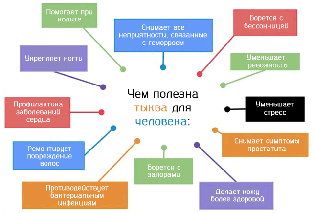 Grâce à une composition chimique aussi riche, la culture a un effet bénéfique sur l'homme. Avec une utilisation régulière de citrouille, une amélioration du fonctionnement des systèmes digestif, cardiovasculaire et nerveux est observée. En outre, le produit aide à renforcer les plaques à ongles et les follicules pileux.