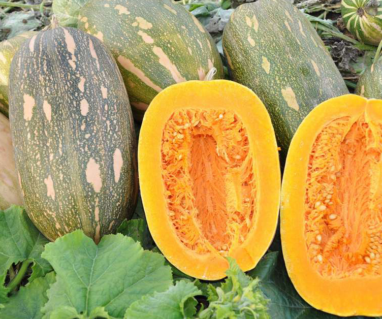 Potiron de mi-saison (130 jours) aux fruits ronds et légèrement aplatis. La peau est marbrée de reflets verts et gris. Convient pour un stockage à long terme, non sujet aux fissures.