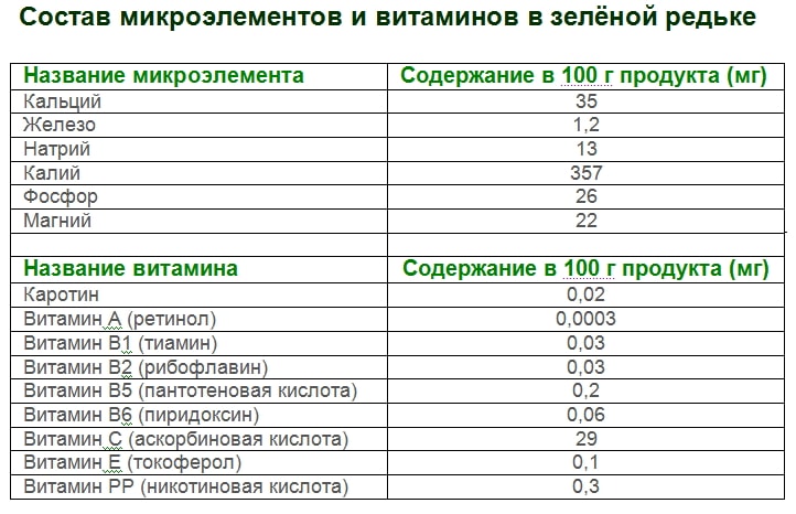 Le radis vert contient une grande quantité de saccharides naturels et de protéines facilement digestibles. Le légume racine contient notamment des vitamines B2 et B1, qui ont un effet positif sur la vision et le système nerveux. La vitamine PP, contenue dans le légume racine, a un effet bénéfique sur la fonction de l'hématopoïèse.