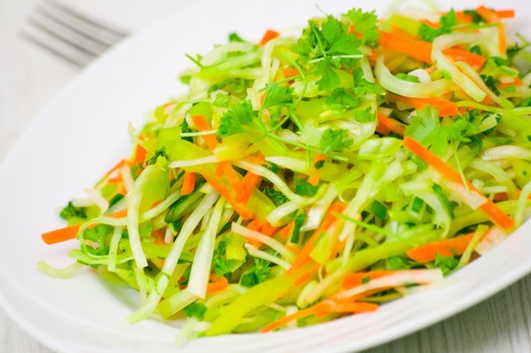 Ces salades sont combinées avec des pommes de terre, du sarrasin bouilli, des spaghettis ou des pâtes.