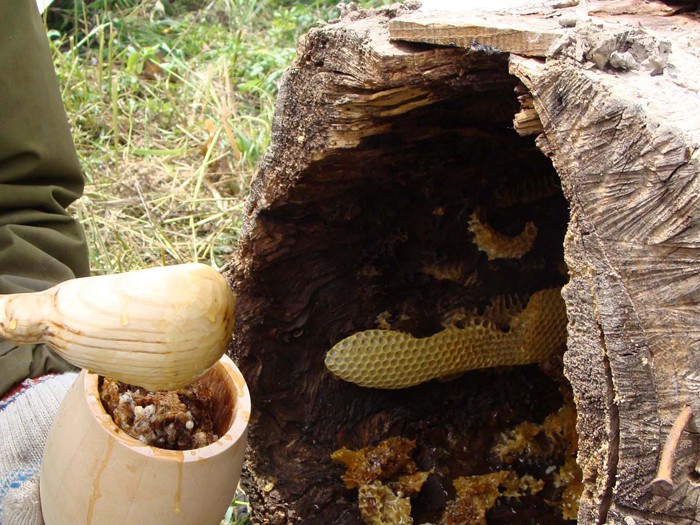 Le processus en lui-même est simple : l'apiculteur grimpe à un arbre, enlève les nids d'abeilles et les met dans un bol.