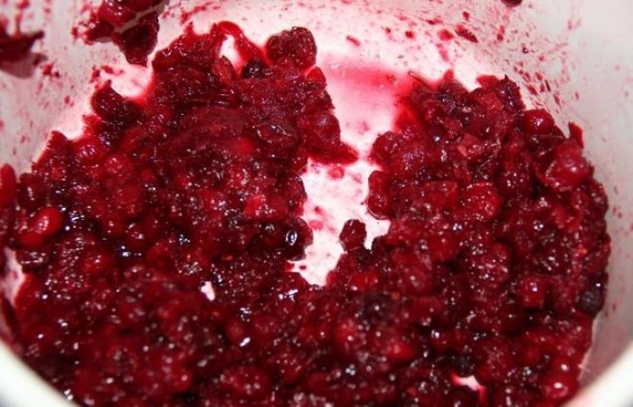 Pour commencer, les fruits sont décongelés, lavés à l'eau courante. Ensuite, les canneberges sont broyées en purée, pour lesquelles elles utilisent un mélangeur ou pétrissent à la main. Hacher les baies à la main permettra d'économiser plus de vitamines et de minéraux.
