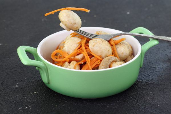 Prenez un kilo de champignons, carottes, ail, quelques feuilles de laurier, deux oignons, cinq cuillères à soupe de vinaigre, un litre d'eau, un demi-verre d'huile de tournesol, une cuillerée de sucre et de sel.