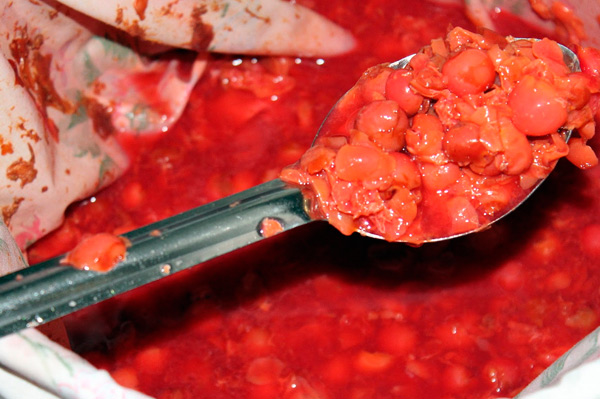 Les cerises récoltées sont triées, débarrassant les débris, les baies écrasées et abîmées. Pliez les fruits dans un récipient, une bassine ou un seau, où il convient de les écraser. Pétrir uniquement avec les mains, pas de mélangeurs - il est important de ne pas détruire les os, sinon l'amertume se fera sentir dans le vin.