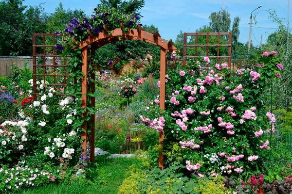 - Rosier grimpant. Une arche en rose, blanc ou rouge, plantée à différents niveaux, est très impressionnante.
