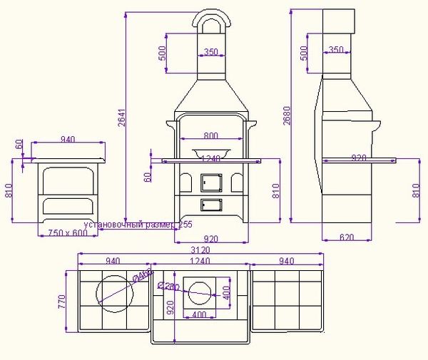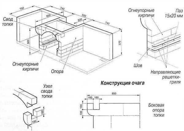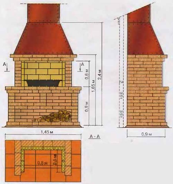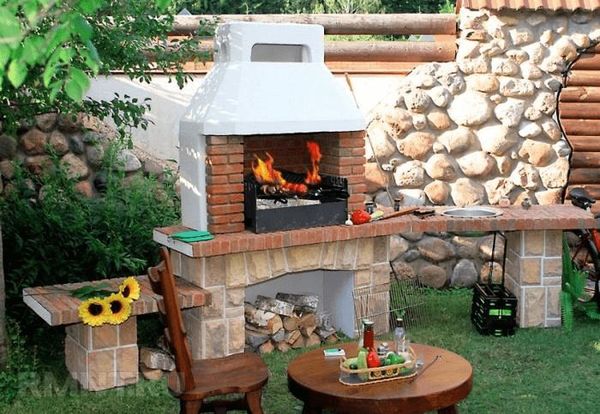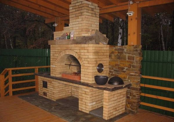 Cette option est souvent trouvée, il est logique d'installer la structure à l'air libre. Dans le gazebo, un coin barbecue sans tuyau gâchera le reste, il y aura beaucoup de fumée dans la pièce. Ce poêle est plus facile à construire, l'algorithme de travail de base est le même que ci-dessus, seule la construction se termine sur la 22ème rangée de maçonnerie.