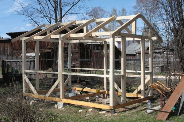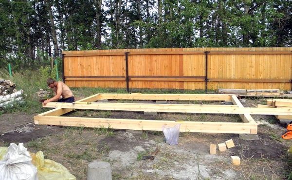 Le harnais inférieur est formé sur les supports de fondation à partir d'une poutre épaisse de 15 × 15 cm.Les barres sont reliées les unes aux autres selon la méthode de la «patte». Des postes de soutien seront rattachés à cette base. Le cadre inférieur est disposé, puis les solives sont montées, sur lesquelles le plancher en planches glissera plus tard.