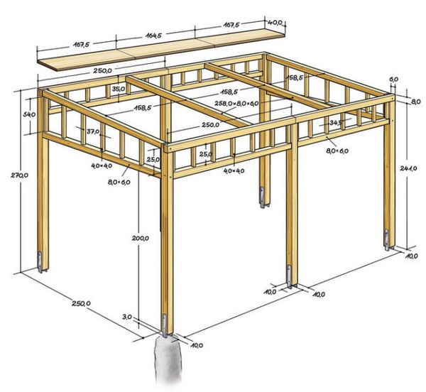 - Tout d'abord, le marquage du terrain est fait, des trous sont creusés, où les supports sont placés. Pour les supports, des tuyaux ou des poutres en bois sont utilisés. N'oubliez pas d'entrer dans votre gazebo.