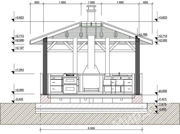 Le type de fondation est déterminé par le type de gazebo : si pour une structure ouverte relativement légère, vous pouvez choisir n'importe quel type - colonnaire, ruban ou solide, alors pour une structure fermée, seul le solide convient, de préférence la dalle. Une base solide est également recommandée si un réchaud ou un barbecue encastrable est prévu. Pour un type semi-ouvert, une fondation solide renforcée avec une fosse, un coffrage et un coussin de gravats sera optimale.