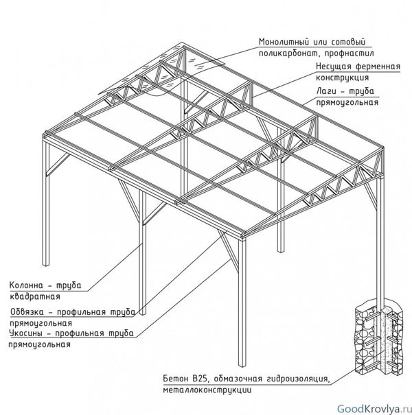 La structure métallique sera élégante, surtout lors de la décoration de son revêtement avec des éléments de produits forgés. L'utilisation de polycarbonate rendra le bâtiment aéré. La conception des couleurs ajoutera de l'originalité et de la luminosité à la structure.