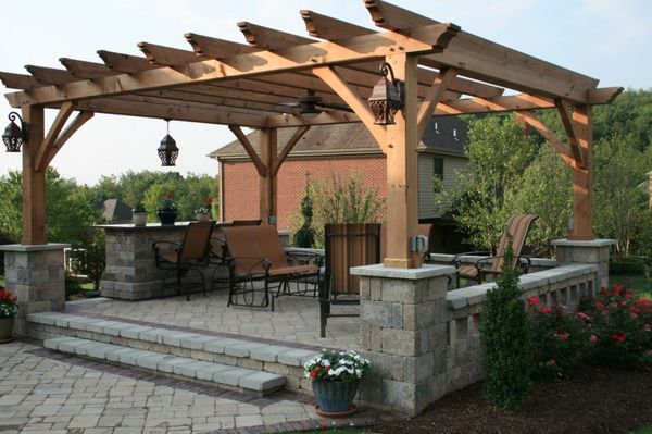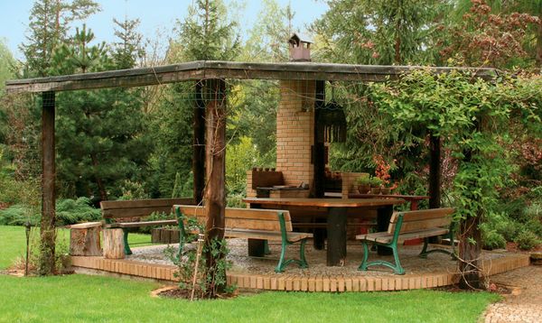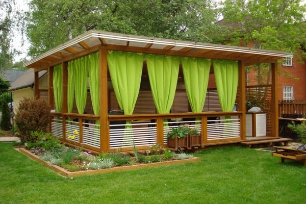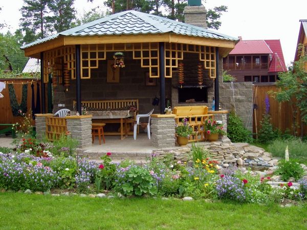 Au stade final - l'embellissement du gazebo: la conception du barbecue, l'installation de meubles et d'éléments décoratifs. Vous pouvez mettre de beaux oreillers lumineux sur des bancs en bois et des bougies parfumées dans des chandeliers exquis sur les tables. Les murs du gazebo peuvent être décorés avec du tulle clair ou des auvents décoratifs spéciaux.