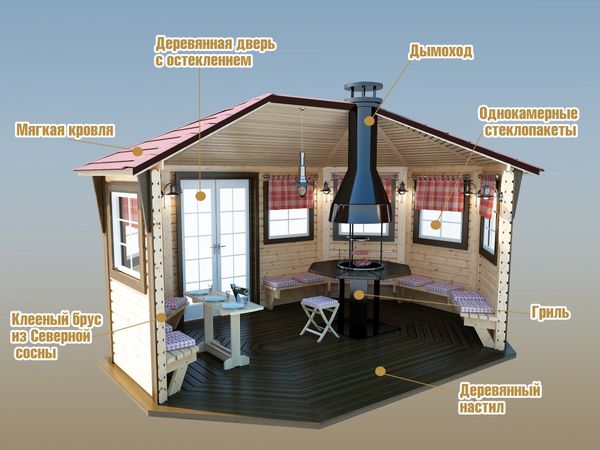 Si la décision est prise d'installer un barbecue dans le gazebo afin de faire frire un barbecue dans la nature, la conception doit être aussi sûre et fiable que possible. Pour cela, une fondation est en train d'être érigée avec l'installation de supports supplémentaires pour un barbecue, un réchaud. Il est préférable de construire des murs en briques ou en bois. Il est impératif d'effectuer au préalable un traitement anti-incendie. Vous pouvez choisir n'importe quelle forme de barbecue, mais il devrait y avoir de petits côtés le long des bords pour soutenir le cadre principal.