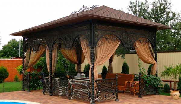 Il est permis de construire en métal galvanisé ou peint. Enfin, s'il y a suffisamment de fonds, cela vaut la peine de construire un gazebo en fer forgé, lui donnant un look à couper le souffle.