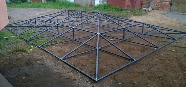 Le cadre est d'abord soudé au sol, puis levé et fixé sur le harnais supérieur. A la fin, la charpente est recouverte de matériau de couverture : polycarbonate, tôle profilée de couverture, tuiles métalliques. Le plus souvent, des feuilles de polycarbonate sont utilisées, elles peuvent avoir une forme incurvée, obtenant des structures arquées pittoresques avec des tuyaux profilés incurvés.