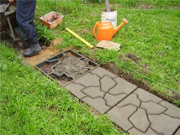 Si vous voulez avoir un tropique en relief dans le jardin, il est composé de dalles de béton séparées de différentes formes. Pour cela, d'anciennes caisses en bois peuvent être réparées et utilisées comme formes pour les futures dalles rectangulaires. Ou concevez un pochoir original pour créer une section distincte de la piste. Ce pochoir peut être acheté dans un magasin spécialisé.