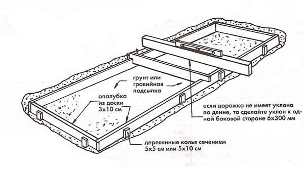 Pour la fabrication de coffrages, vous aurez besoin de planches de faible épaisseur (2 à 5 cm). La largeur de ces lattes de bois ne doit pas être inférieure à la hauteur des futurs chemins (15 à 20 cm). Nous équipons les sections droites de telles poutres et du contreplaqué ou un autre matériau flexible similaire est utilisé pour les virages.