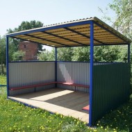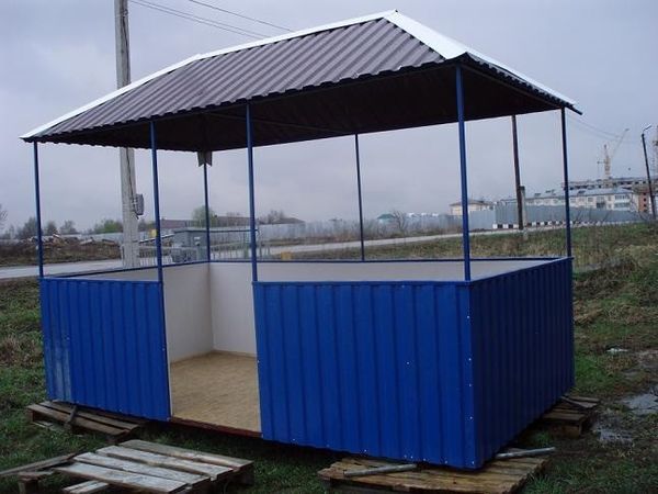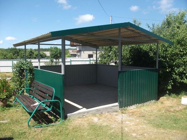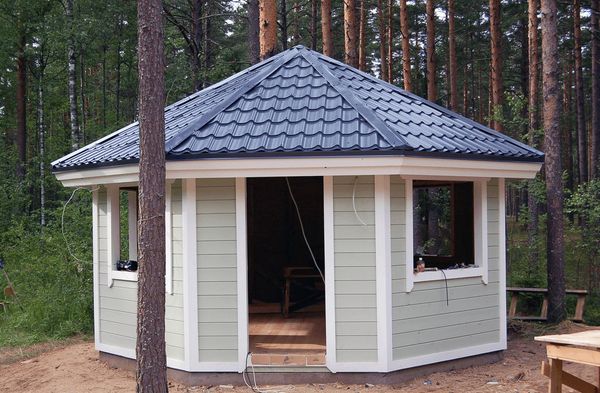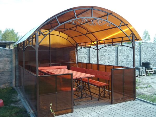 Sur les côtés, le gazebo est mieux gainé avec un bardage métallique. En raison du traitement polymère des matériaux, même au stade de leur production, une telle finition ne pourrit pas, elle résiste bien à la chaleur et au gel.