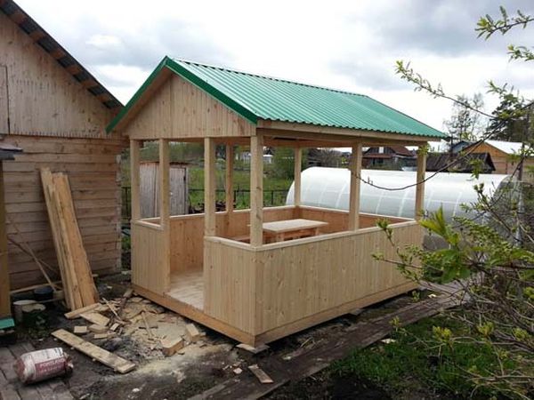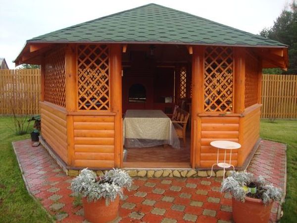 En présence de bois, les matières premières peuvent être fabriquées à la maison. Les lattes inclinées transversalement sont idéales pour décorer des gazebos sans murs vierges. En été, ces bâtiments sont toujours frais et la fumée du barbecue sort à l'extérieur.