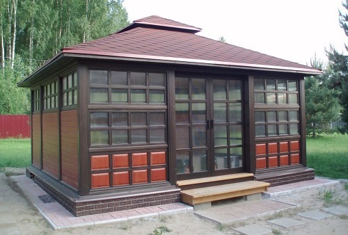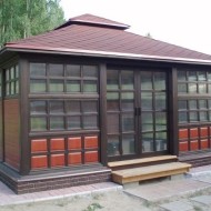 Grâce au lattage, la structure a un look complet et complet. La grille en treillis sert de support aux cultures grimpantes et fleuries, qui sont plantées autour du périmètre de la structure. Un treillis décoratif de lattes crée une ombre partielle et protège du soleil brûlant, et sert également de barrière contre les regards indiscrets des voisins. La moustiquaire protège contre les moustiques, mouches et autres insectes gênants.