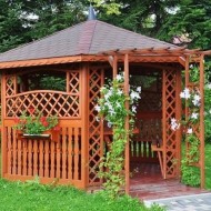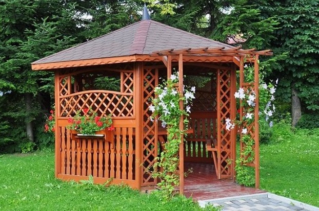 Pour la fabrication d'un kiosque de jardin, on utilise de la pierre, du bois, du bois, du métal et même divers matériaux de rebut. Mais les plus populaires sont les structures en bois, car elles se marient harmonieusement avec le fond des cultures fruitières et ornementales poussant dans le jardin. Un tel bâtiment peut être complété par un treillis décoratif composé de lattes étroites.
