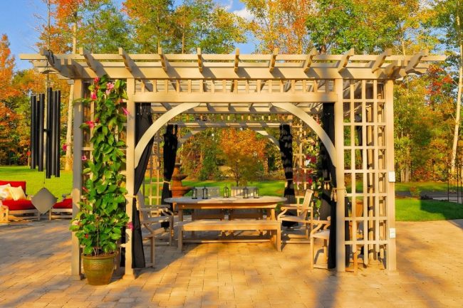 Le treillis en bois naturel est une véritable décoration du chalet d'été.Vous pouvez augmenter l'attrait esthétique du bâtiment en ajoutant un décor supplémentaire. Il est recommandé d'ouvrir les lattes avec du vernis ou de la peinture. Les kiosques avec des tentures en tissu, des fenêtres vintage et des compositions florales semblent intéressants.