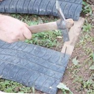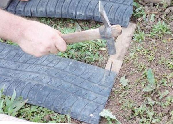 Tout d'abord, il est nécessaire de mesurer et de traiter correctement les produits. Pour que le caoutchouc se redresse plus rapidement, l'outil électrique est guidé le long du bord et ce n'est qu'alors que le pneu lui-même est coupé. Les bandes finies doivent être clouées sur des planches de pin et posées sur un sol nettoyé. La distance optimale entre les éléments du revêtement est de 1 mm. L'espace est nécessaire pour le drainage complet de la pluie et de l'eau de fonte.