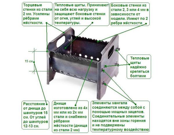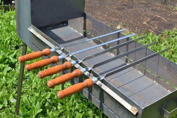 Le modèle présenté est idéal pour ceux qui aiment se détendre dans les bois et les montagnes. L'épaisseur optimale de la structure varie de 3 à 4 cm.Dans le choix des matériaux pour le dispositif inférieur, il est préférable de privilégier des tôles d'acier de 3 mm. Ils résistent bien aux températures élevées et aux contraintes mécaniques. La taille du barbecue dépend moins de la quantité que de l'épaisseur des brochettes. Idéalement, ce chiffre est de 75 cm. Pour les déplacements fréquents hors de la ville, vous aurez besoin d'une unité plus légère de 40 centimètres.