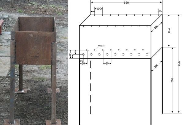 L'autoproduction d'un barbecue selon le schéma prévoit également l'utilisation de tôles, de ferrures et d'angles. Vous devez d'abord souder le bloc rectangulaire pour le charbon et les éléments de support de la structure. Préparez ensuite un support amovible et, surtout, une base solide pour l'unité. Pour poser les fondations, vous aurez besoin de ciment M-400, de sable de rivière, d'argile, de tiges métalliques, de briques et de planches de coffrage séchées.