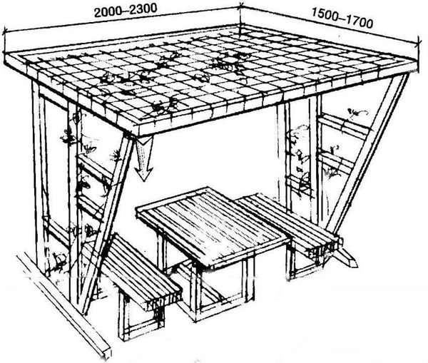 Un gazebo à baldaquin n'est pas difficile à construire. Ici, vous pouvez confortablement organiser des dîners à la maison et boire du thé, vous détendre après les travaux de jardinage, vous protéger de la chaleur et de la pluie.