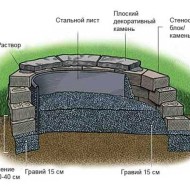 - Ensuite, vous devez marquer le contour intérieur de la structure et couler une base en béton sous celle-ci d'une hauteur de 10 à 15 cm.Le diamètre intérieur est désigné de manière à ce qu'il soit possible de faire une maçonnerie interne avec un petit écart par rapport à l'extérieur maçonnerie en pierre.
