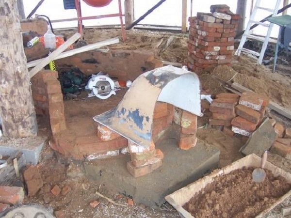 - Sur la fondation en béton finie, placez la moitié de la baignoire dans laquelle il n'y a pas de trou d'évacuation (mise à l'envers, avec une coupe vers la façade). Ce sera un foyer.