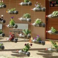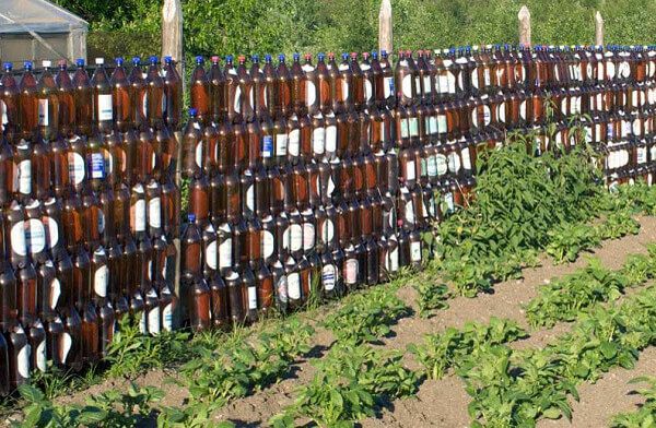 Les bouteilles placées horizontalement sont un enclos exquis pour tout jardin de fleurs. Plusieurs centaines de bidons de 2 litres, de mortier de ciment et de vieux pneus sont utiles aux travaux. Ces derniers servent de support à des structures de 1,5 mètre.