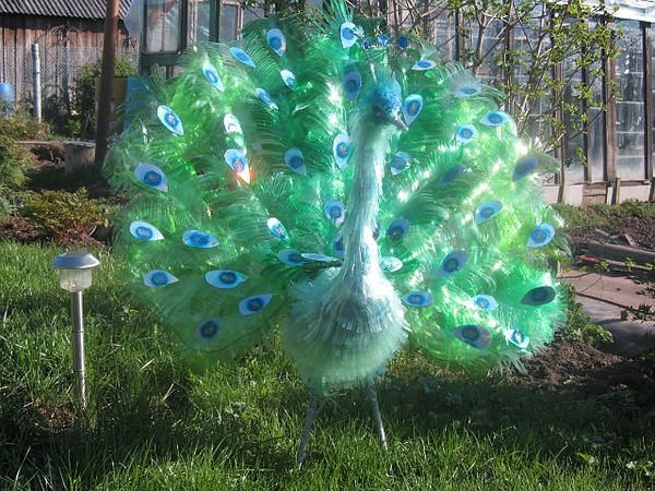 Si vous devez décorer l'entrée du bâtiment principal, fabriquez des cygnes ou des paons avec des bouteilles. Des oiseaux gracieux avec de grandes ailes et des queues duveteuses deviendront une décoration digne d'un étang, de la zone autour d'une fontaine ou d'un jardin de fleurs.